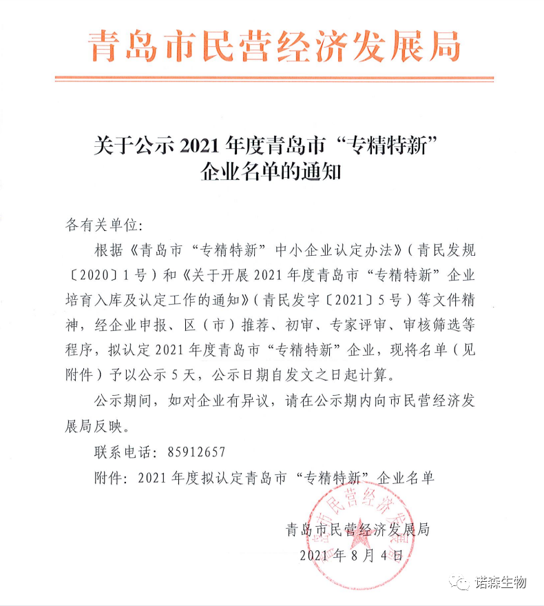 2021年8月4日,青島市民營經(jīng)濟(jì)發(fā)展局公開2021年度青島市“專精特新”企業(yè)名單,根據(jù)《青島市“專精特新”中小企業(yè)認(rèn)定辦法》(青民發(fā)規(guī)〔2020〕1號(hào))和《關(guān)于開展2021年度青島市“專精特新”企業(yè)培育入庫及認(rèn)定工作的通知》(青民發(fā)字〔2021〕5號(hào))等文件精神,經(jīng)西海岸新區(qū)推薦、初審、專家評(píng)審、審核篩選等程序,認(rèn)定青島諾森生物技術(shù)有限責(zé)任公司為青島市“專精特新”企業(yè)。